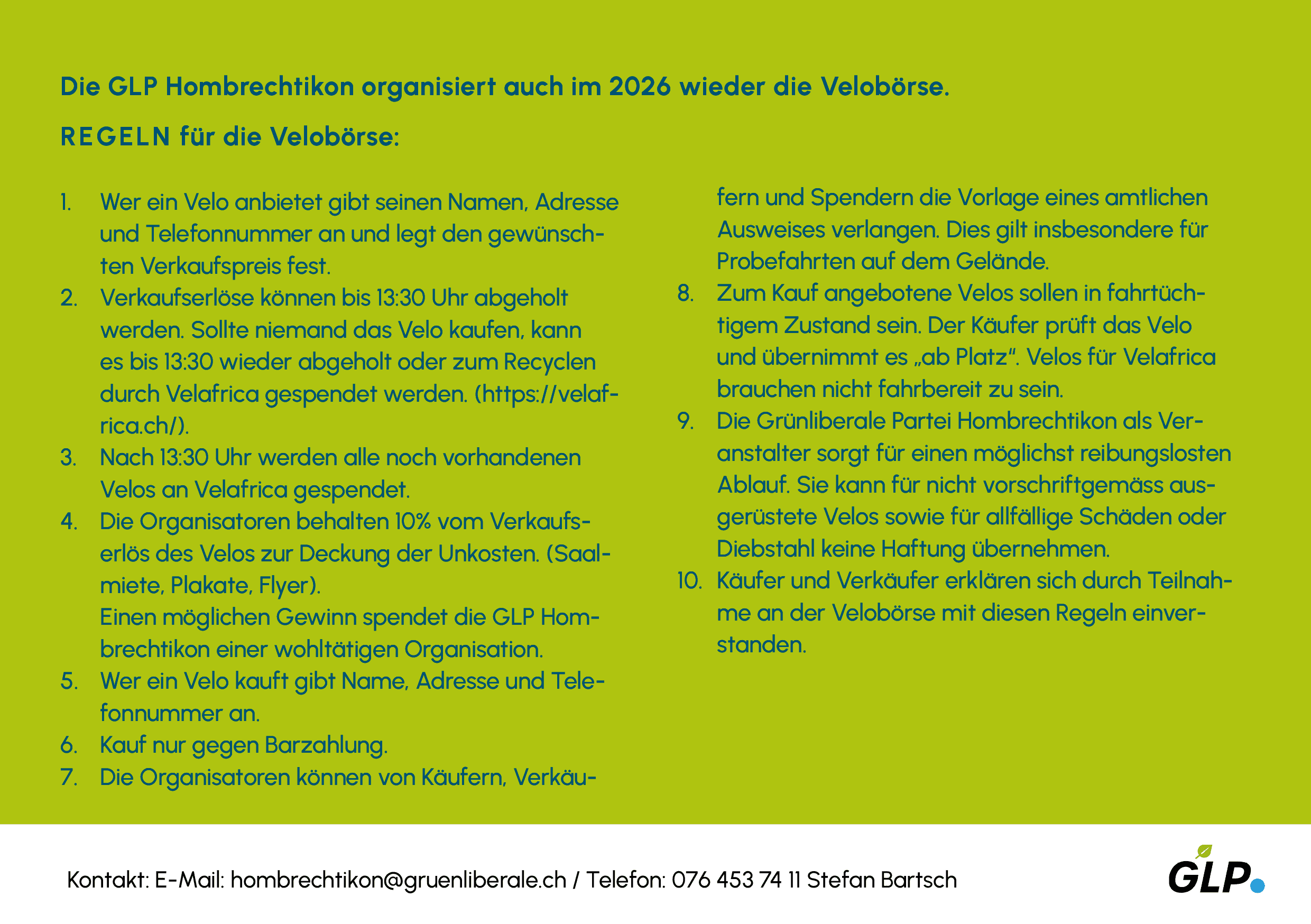 Am Samstag, 21. März 2026, organisiert die GLP Hombrechtikon wieder die beliebte Velobörse beim Gemeindesaal. Von 8.30 bis 12.00 Uhr können Velos für Gross und Klein gekauft, verkauft oder gespendet werden. Ein nachhaltiger Anlass für die ganze Bevölkerung – wir freuen uns auf viele Besucherinnen und Besucher! 🚲